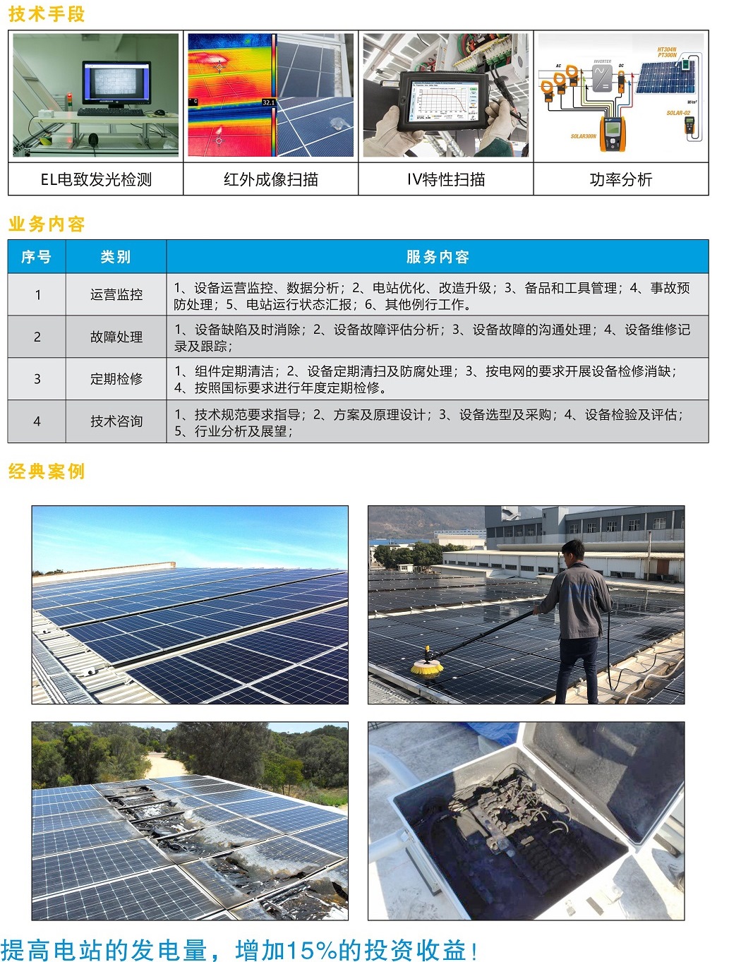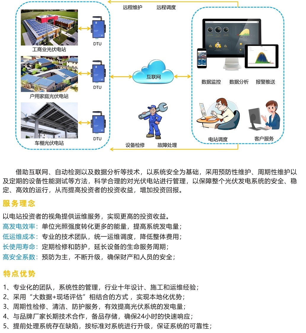 設(shè)備維修升級(jí)、組件清洗、除塵等業(yè)務(wù),以保障整個(gè)光伏發(fā)電系統(tǒng)的安全、穩(wěn)定、高效的運(yùn)行,從而提高投資者的投資收益率。