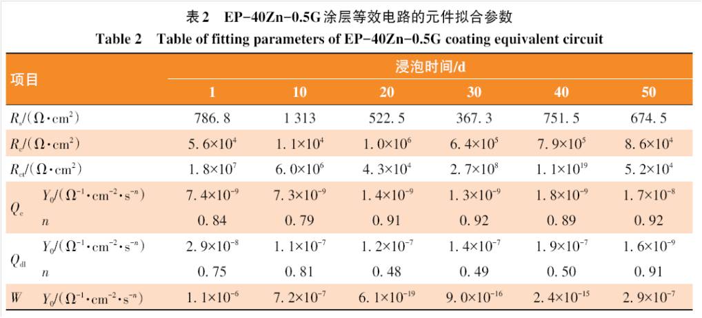 隨著浸泡時(shí)間的進(jìn)一步增加,EP-40Zn-0.5G 和EP-40Zn-1.0G對(duì)應(yīng)涂層的OCP逐漸降低至-0.78 V以下,此時(shí)涂層基本喪失物理阻隔作用,腐蝕介質(zhì)在基體界面通過涂層內(nèi)的導(dǎo)電通路與鋅粉發(fā)生腐蝕電偶反應(yīng),涂層進(jìn)入陰極防護(hù)期。