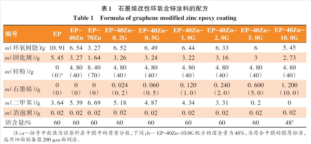 石墨烯溶劑型漿料GRF-FLGOD(固含量10wt%),蘇州格瑞豐納米科技有限公司;環(huán)氧樹脂YD011-X75(固含量75%)、聚酰胺固化劑G-5022X70(固含量70%):工業(yè)級(jí),國(guó)都化工(昆山)有限公司;鋅粉WLZn-800:工業(yè)級(jí),湖南新威凌金屬新材料科技股份有限公司。