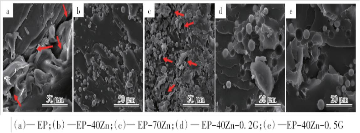 當(dāng)鋅粉質(zhì)量分?jǐn)?shù)為70%時(shí),樹脂部分無(wú)法實(shí)現(xiàn)貫通連接,涂層內(nèi)部產(chǎn)生了如圖1(c)示的較多微孔缺陷,涂層的屏蔽作用因此難以充分發(fā)揮。含鋅涂層EP-40Zn、薄層石墨烯含鋅涂層EP-40Zn-0.5G,對(duì)應(yīng)的斷面形貌相對(duì)平整,也未發(fā)現(xiàn)明顯的內(nèi)部缺陷。