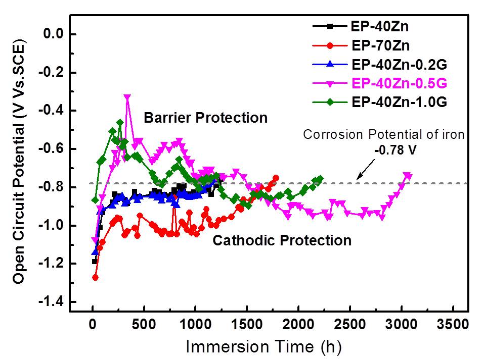 添加優(yōu)化比例的薄層石墨烯涂層,其物理阻隔和陰極保護(hù)的持續(xù)性都得到很大改善。EP-40Zn-0.5G和EP-40Zn-1.0G的綜合腐蝕防護(hù)時(shí)間分別為3000h和2136h。