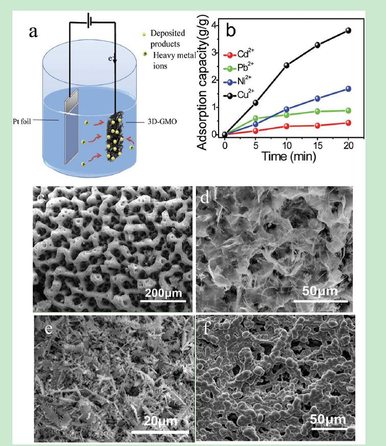 蘇州格瑞豐技術(shù)團(tuán)隊(duì),提出了一種新高密度三維石墨烯的制備路線(xiàn),以金屬氯化物為催化劑前驅(qū)體,采用化學(xué)氣相沉積方法常壓下簡(jiǎn)單快速實(shí)現(xiàn)了高密度高質(zhì)量三維石墨烯宏觀體(3D-GMOs)的制備,克服了常規(guī)泡沫鎳三維石墨烯孔隙率高,密度低,機(jī)械性能弱等缺點(diǎn)。制備的3D-GMOs導(dǎo)電率高達(dá)~12 S/cm,比表面積為~560 m2/g。利用3D-GMOs為電極對(duì)水溶液中的重金屬離子進(jìn)行快速高容量的電沉積后,對(duì)Cd2+,Pb2+,Ni2+,Cu2+的吸附能力分別達(dá)434 mg/g,828 mg/g,1683 mg/g,3820 mg/g。在反向電場(chǎng)作用下,可以快速高效的脫吸附(~1 min,脫吸附效率>96%),提出了一種新穎的快速的制備高密度3D-GMOs,揭示了3D-GMOs在廢水除去重金屬離子重要的潛在應(yīng)用。并且這種三維宏觀體在儲(chǔ)能,導(dǎo)熱散熱,電磁屏蔽以及一些復(fù)合體系制備方面有著廣泛的應(yīng)用前景。相關(guān)結(jié)果見(jiàn)Scientific Reports 3, 2125(2013)。